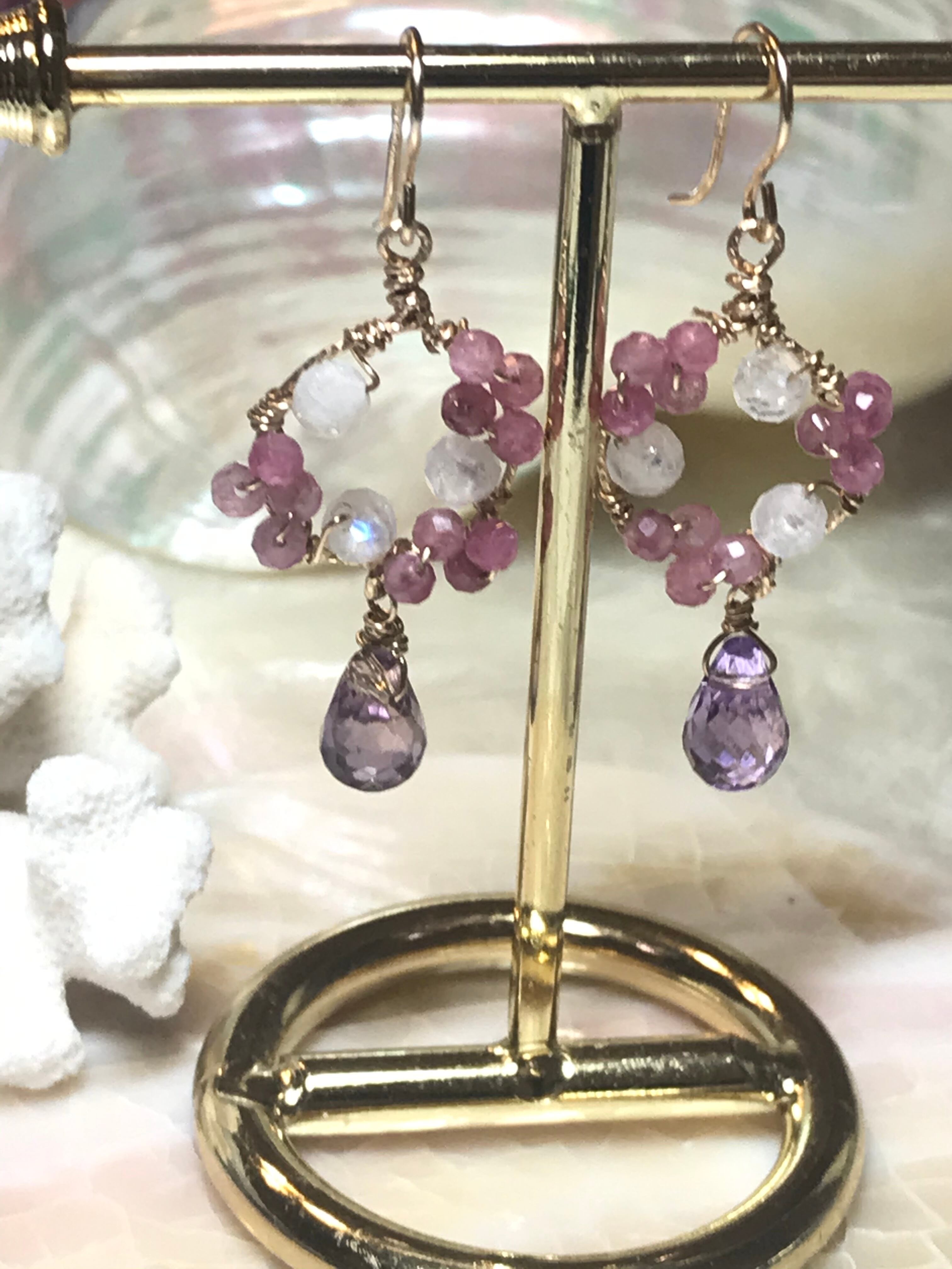 14kgfのにピンクトルマリン、ホワイトラブラドライトを巻き付けたピアスです。